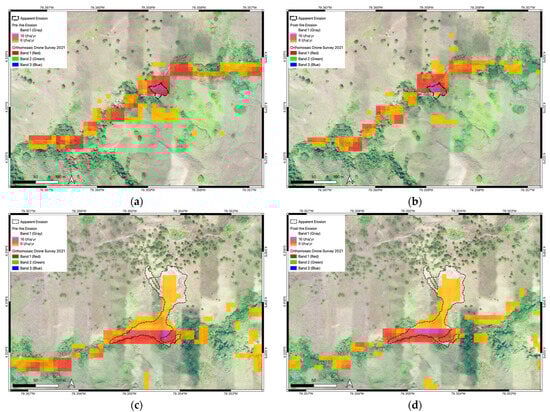 To verify the significance of the RUSLE regarding the spatial detection of highly erosive areas for the potential implementation of SWBE measures in fire-prone areas, the two developed raster products, predicting high erosion in pre- and post-fire conditions, were compared to the orthomosaic, as well as the 3D model derived from the high-resolution RGB images of the UAV survey (Figure 10).
