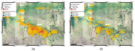 Comparison of highly erosive areas at the sub-basin with high-resolution UAV data: (a) outlet: pre-fire; (b) outlet: post-fire; (c) lower area: pre-fire; (d) lower area: post-fire; (e) higher area: pre-fire; (f) higher area: post-fire.