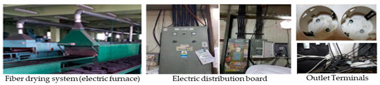 There are various factors that cause initial fires, such as electrical outlets, general distribution circuits, and oil–vapor–gas cluster spaces. In most cases, these places are out of reach of human hands or remote from human attention, causing the spread of fire by missing the initial suppression time in the event of a fire. In addition, the absence of suppression means in the early stages of a fire causes human and property disadvantages, missing the so-called golden time [1]. Figure 1 shows the drying electric furnace of a clothing weaving company, the electric distribution box, and the outlet terminal.