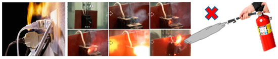 Most of the cases in which a fire spreads occur in a remote place and are invisible. Buildings are often old or poorly managed, and it is very difficult to respond to fires that occur in underground distribution boards and outlets [2,3,4]. Figure 2 shows an intricately connected multi-tab. After a long period of use, dust accumulated in the multi-tab causes a short circuit, which causes a fire. In order to prevent this, the use of flame-retardant materials is mandatory, but it is difficult to block the spread of fire to surrounding flammable substances completely with flame-retardant materials.