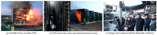Figure 3 shows a fire caused by an electric short circuit: (a) the 24th floor of Grenfell Tower, London, England, where 160 people died or went missing, 78 people were injured, and 17 were left in critical condition; (b) scenes of the fire inside the ESS device and the fire magnification; and (c) fire scene at Seomun Market in Daegu, Korea, where 679 stores were burned down due to an electric short circuit, and the initial response was delayed due to narrow vehicle roads due to the old traditional market structure.