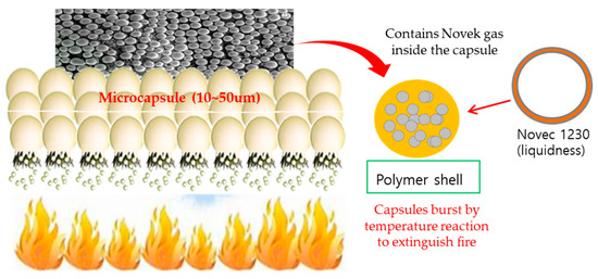 Microcapsule fire-extinguishing agents are manufactured in the form of microcapsules based on adhesive paste composites such as ABS and PC, which perform an immediate explosion and fire suppression operation within 10 s during fire contact. Despite various temperature ranges, it is manufactured to operate only at fire temperature and performs intelligent operation [8]. Figure 4 shows the form of capturing Novec 1230 gas in a microcapsule.