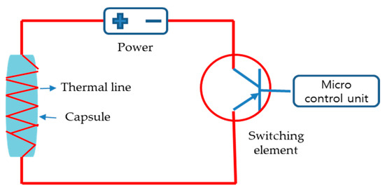 Figure 6 shows the control diagram for controlling the microcapsule in case of fire contact. The temperature at which the capsule bursts is 110~165 °C, which is the same as the fire temperature, and a heating wire is wound around the capsule and current flows to heat it to 200 °C or higher so that the capsule bursts. Nichrome wire is used as a heating wire, and it can generate heat at 200 °C or higher within 10 s, and it is implemented so that it can generate heat even when supplied with a lithium ion battery.
