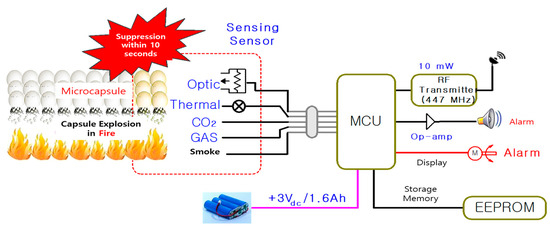 - Yoon, D.H.; Lee, D.H.; Lee, D.W. Development of IoT Sensing Technology Convergence Intelligent Fire Extinguishing System Using Microcapsule Digestives. In Industrial Complex Corporation R&BD Capacity Building Project; Ecosense Co. Ltd.: Seoul, Republic of Korea, 2020. [Google Scholar]