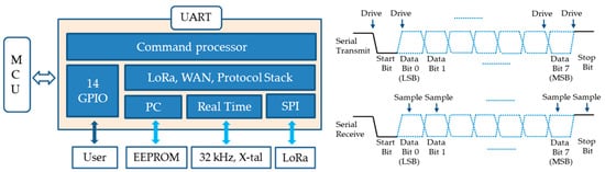 Figure 7 shows the implementation of an IoT circuit that processes signals detected from sensors. It consists of a microcontrol unit (MCU) that controls the received signal and SPI that connects the peripheral sensing function, GPIO, UART, and wireless LoRa. The program editor and downloader use the AVR Studio Programmer [9,10].