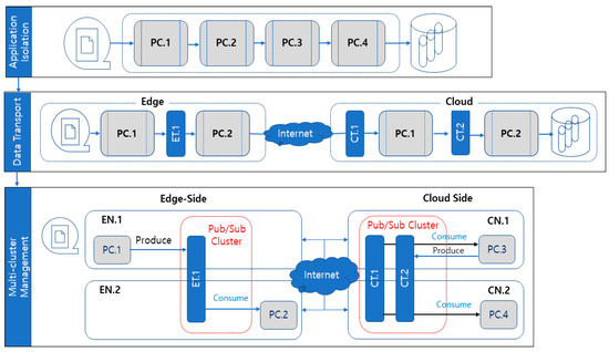 In the case of IoT node failure or intermittent long-distance network connections, local fault tolerance needs to be considered to preserve the system state locally at the edge. To address this issue, we implement a new fault tolerance architecture IoT for IoT applications based on the IoT interworking monitoring computer owned by customers and the cloud interworking technology operated by the national fire safety net. The Edge-IoT architecture consists of three layers: (i) application isolation, (ii) data transport, and (iii) multi-cluster man-administration layer. Based on this tiered design, the architecture allows computing deployment at the edge or cloud without modifying the source code [15]. IoT architecture is designed to provide fault tolerance to both edge and cloud-side clusters and to provide integrated multi-cluster management that enables failover in large interconnected networks. Furthermore, IoT’s separate clusters for edge and cloud allow edge devices to operate independently even when they are separated from the cloud. Thus, this architecture operates in degraded mode even when cloud connectivity is lost. This architecture is logically constructed from underlying technologies with three abstraction layers [16]. Figure 10 shows an application with application separation, data transfer, and multi-cluster management layers and four processing steps, PC.1, PC.2, PC.3, and PC.4. Here, the PC processing container, ET edge topic, CT cloud topic, EN edge node, and CN cloud node are described.