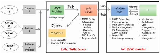 Figure 11 shows the functional configuration of the communication network based on Figure 7, Figure 8, Figure 9 and Figure 10. Data communication is performed between the IoT middleware in Figure 8 and the gateway in Figure 9, and the edge IoT architecture of Figure 10, such as application separation, data transfer, and multi-cluster management layer and PC.1, PC.2, PC.3, and PC.4, is programed according to processing steps. Based on this, a program is implemented to achieve edge and cloud according to the sensor data operation. The IoT Wan server performs the publishing function between the MQTT publisher and the LORA server, and the MQTT publisher stores messages, and the Laura server performs the query function through local DB or device registration. The Laura server performs MQTT broker, package analysis, redundancy check and error check, and registration check. When the Laura server pops up the IoT middleware (M/W) monitor, the IoT gate middleware exchanges UI and API Call. In this case, the IoT gate middleware function is programed to perform MQTT subscribers, message queues, data collection, device management, I/O management, alarm alerts, legacy APIs, and real-time processing. A user interface (UI) monitors, operates users, operates programs, and operates menus through a dashboard.