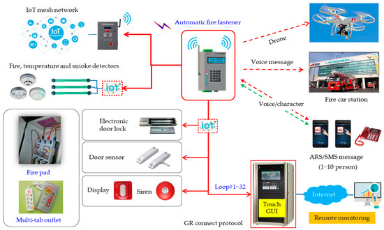 Figure 12 constitutes the entire fire alarm network. The automatic fire fastener first contacts the fire car station in the event of a fire, controls the emergency opening and closing of the building, and issues a fire occurrence alarm signal through the siren [17,18,19].