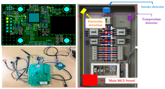 When the fire suppression device is installed close to the fire area of the distribution panel, fire will occur within 10 s in case of a fire. It suppresses ash. Pad and cord-type fire-extinguishing products can be easily installed in a narrow space (2~3 mm) without special facilities or construction and can be applied to various targets. Particularly, it is easy for the public to install, and it can be used not only for new facilities but also for various exposures to old industrial sites, public places, buses, and schools with high risk factors. Figure 13 shows a configuration example in which the main MCU PCB is installed with the sensor position within the electric distribution panel.