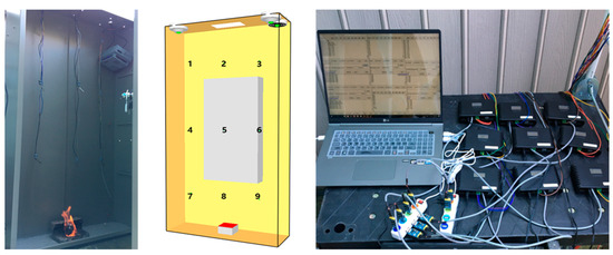 Figure 14 models a rectangular parallelepiped-shaped distribution panel case with a width of 80 cm, a length of 25 cm, and a height of 160 cm as a fire model. Three rows are hung from the ceiling of the distribution panel at equal intervals, and three temperature sensors are installed evenly at equal intervals in each row, and the detector is installed on the upper left [22,23].