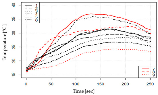 Figure 16 shows the temperature change for each sensor position No.1~9 in Figure 14. Here, the temperature at positions 7 and 4 is the highest. After that, 8, 1, and 2 were high, and the temperature at positions 3, 6, and 9 on the right was the lowest. Through this, it can be assumed that, although the combustible material is located in the center inside the distribution panel, in the convection phenomenon by heat, the heated air tilts to the left and rises and falls to the right. It can be seen that the temperature in the detector rises steadily with an S-shaped conversion curve at a rate of about 48 s to 2 °C/min for about 3 min and then falls again after a high point.
