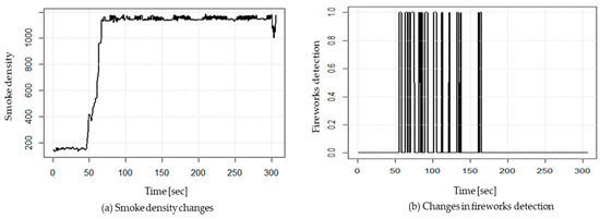 Figure 15 shows the changes in temperature and smoke concentration over time. In the implemented system, an experiment is conducted to measure the air temperature inside the distribution panel using a hot air fan under the distribution panel. The temperature of the hot air fan was set to 630 °C, and the initial temperature inside the distribution panel was set to 26 °C. It took about 7 min for the temperature to rise to 60 °C, and a temperature increase curve was recorded and used to set the temperature increase width of the difference sensor [20].
