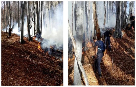 - Burlui, I.; Burlui, M.C. Incendiile forestiere: Elemente caracteristice, factori determinanți și măsuri de gestionare. Bucov. For. 2018, 18, 165–175. [Google Scholar] [CrossRef]