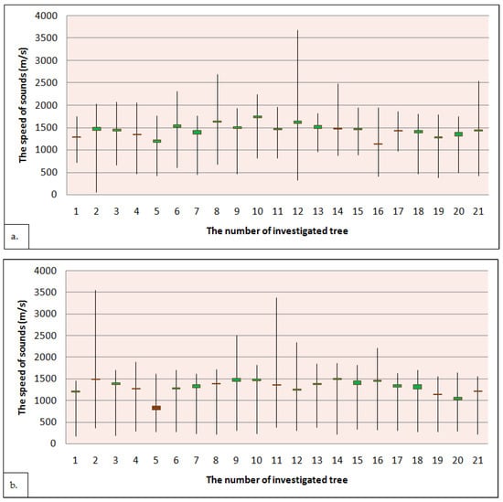 - Mușat, E.C. Analyzing the sound speed through the wood of horse chestnut trees (Aesculus hippocastanum L.). Bull. Transilv. Univ. Brasov. Ser. II—For. Wood Ind. Agric. Food Eng. 2017, 10, 55–66. [Google Scholar]