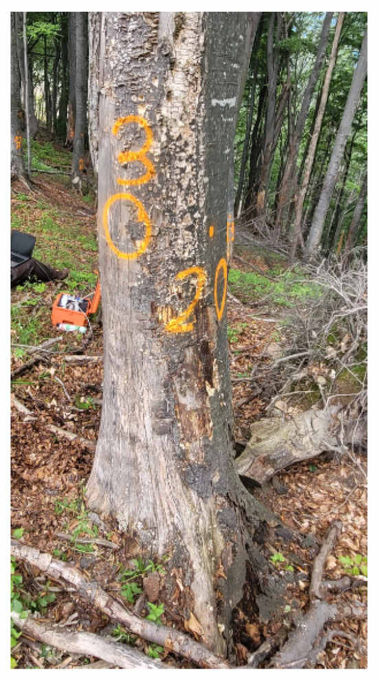 - Sandoz, J.L.; Lorin, P. Tares internes de bois sur pied: Détection par ultrasouns. Rev. For. Fr. 1996, 48, 231–240. [Google Scholar] [CrossRef]