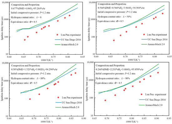 In this paper, based on the UC San Diego DME model constructed by the UC San Diego 14-step DME chemical kinetic reaction model and the GRI-Mech 3.0 mechanism (containing 53 substances and 325 elementary reactions) [22], the UC San Diego 2016 model containing the H2 oxidation reaction mechanism from UC San Diego is embedded [23]; thus, the DME/H2-blended gas chain reaction mechanism model was obtained. Here, the reaction mechanism model of DME/H2-blended gas is called the UC San Diego 2016 model. Through an experimental study on parameters such as the ignition delay time, explosion overpressure, and explosion temperature, many scholars at home and abroad have verified the accuracy of the UC San Diego 2016 model to predict the chemical kinetic properties of common C1-C4 substances under specific conditions. However, there are few reports on the accuracy of the UC San Diego 2016 model in predicting the chemical kinetic characteristics of DME/H2-blended gas. Therefore, it is compared with the AramcoMech 2.0 model of the National University of Galway, Ireland, which was constructed by Galway University Center for Combustion Chemistry in combination with the H2 gas mixture pyrolysis oxidation mechanism of A. Kéromnès, Y. Zhang, and M. Ó Conaire et al [24,25].