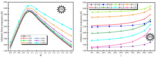 Adiabatic flame temperature evolution curves. (a). Adiabatic flame temperature evolution at different λ; (b). Adiabatic flame temperature evolution at different Φ.