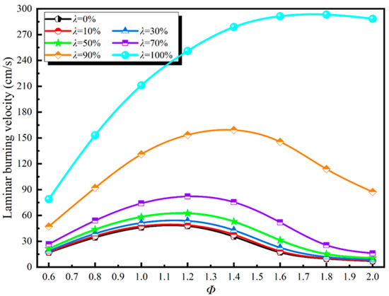 The laminar flame speed is the velocity of a one-dimensional adiabatic plane flame surface relative to incoming unburned premixed gas. The laminar flame speed is one of the most important parameters that reflect the combustion characteristics of the fuel. The trend in laminar flame speed of DME/H2-blended gas with Φ and λ is shown in Figure 3.
