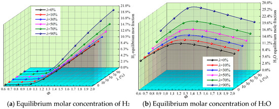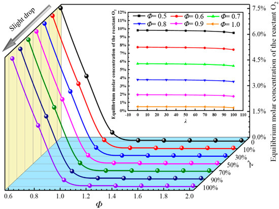 The risk of deflagration can be inferred by studying the equilibrium molar concentrations of reactants, which are key free radicals of the intermediate products and main products [32,33,34]. Figure 4 shows the equilibrium molar fraction waterfall diagram of the reactant O2 at different Φ and λ.
