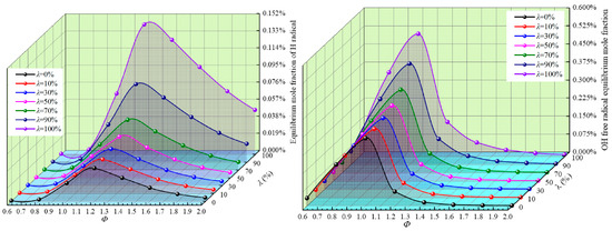 H radicals can react with O2, H2, and other gasses to release a large amount of heat energy. OH radicals have a stronger oxidation ability in the reaction, and they can accelerate the reaction rate through the chain reaction, thus making the reaction more intense. Figure 5 shows the equilibrium molar fraction waterfall diagram of H and OH radicals at different Φ and λ.