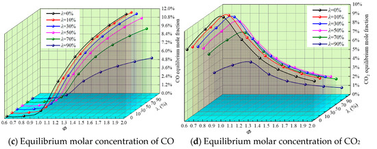 In the whole reaction system, complete combustion and incomplete combustion often exist at the same time due to the change in reaction conditions and reactant characteristics. Figure 6 shows the equilibrium mole fraction waterfall diagram of the complete combustion products CO2 and H2O and the incomplete combustion products CO and H2 under different λ and Φ.