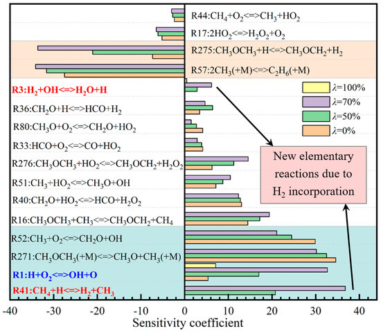 In order to understand the reaction process, the temperature sensitivity of DME/H2-blended gasses was analyzed from the point of view of the main elementary reactions [35,36]. Figure 7 shows the temperature sensitivity coefficient distribution of different H2 blending degrees (λ = 0%, 50%, 70%, 100%) at Φ = 1, including initial temperature at 298 K and initial pressure at 1 atm. Here, the positive value means promoting the reaction process, while the negative value means inhibiting the reaction process. The greater the absolute value of the sensitivity coefficient, the stronger the corresponding promotion or inhibition ability.