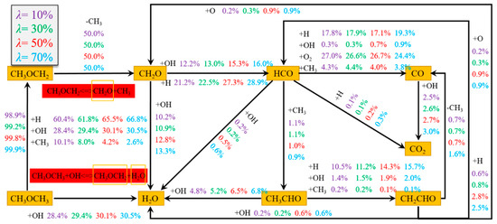 In order to elaborate the cause and process of deflagration and to reveal the key steps in the chain reaction [37], the main pathways of the DME/H2-blended gas deflagration reaction and the main radicals, such as H, OH, O, and CH3, in each branch of the reaction were analyzed at Φ = 1.0, λ = 10%, 30%, 50%, and 70% with the initial temperature at 298 K and the initial pressure at 1 atm. The main reaction path and the radicals of the products or reactants in each branch reaction are shown in Figure 8.