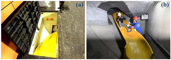 Compared with ordinary highway tunnels, underwater road tunnels are longer, deeper, and have a more closed traffic environment, increasing the difficulty of fire-fighting, evacuation, and smoke exhaust [14]. In addition, because underwater road tunnels usually bear a large amount of urban traffic demand, they also have the characteristics of periodic traffic congestion and high traffic flow [15]. About 70% of underwater highway tunnels are shield tunnels, with a small cross-section and difficult cross-channel construction [16]. This can save construction costs, improve the waterproof performance of the project, and improve evacuation efficiency and space utilization [17]. Therefore, vertical evacuation facilities (as shown in Figure 1), such as escape slides or stairs, are generally used [18]. Figure 1 also shows the two forms of escape slide entrance in highway underwater tunnels. Specifically, one form of escape door placement is to install them on the tunnel walls, aligning with the general public’s anticipation of where emergency exits should be located (see Figure 1c), as depicted by [18]. Conversely, another form involves positioning the escape doors on the tunnel floor, which, when closed, are not particularly conspicuous or easily noticeable (see Figure 1d). When a fire occurs in an underwater highway tunnel, people can enter the underground escape passage through the escape slide [19]. This escape method fully utilizes the surplus space below the lane slab in the tunnel [20]. However, the complex fire risks and special escape methods of underwater road tunnels increase the uncertainty of their fire safety.