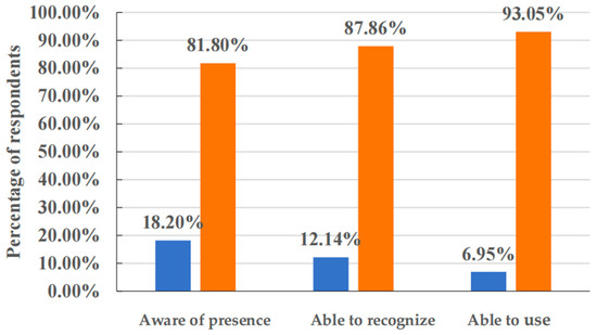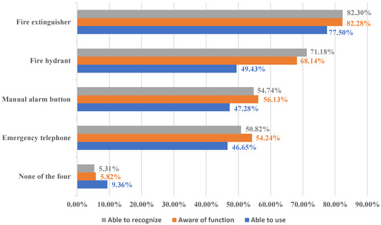 Fire extinguishers, fire hydrants, manual alarm buttons, and emergency telephones are common emergency fire-fighting facilities in underwater road tunnels. People’s awareness of emergency fire-fighting facilities in underwater road tunnels is divided into three different levels, which are the ability to recognize them, awareness of their function, and ability to use them. On the one hand, people’s awareness of different types of emergency fire facilities is uneven. Most people are only familiar with parts of emergency fire-fighting facilities, such as fire extinguishers and hydrants. On the other hand, people usually understand that there are various emergency fire protection facilities but are not clear about their correct usage method. In other words, people can recognize them but cannot use them very well. As shown in Figure 4, the respondents in this study are most familiar with fire extinguishers, followed by fire hydrants. As for manual alarm buttons and emergency telephones, most of respondents only know of their function but cannot recognize or use them. Furthermore, there are still some people who are not familiar with these four emergency fire facilities, accounting for more than 5%.