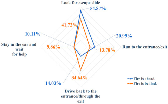 When there was a fire behind the vehicle in an underwater road tunnel, as shown in Figure 3, only 34.64% of the respondents chose to drive out of the exit quickly or ask the driver to do so, accounting for less than 50%. A total of 9.86% of the respondents chose to wait for fire rescue in the car, while 13.78% chose to walk or run to the tunnel exit. In this situation, some people still chose to find escape slides according to evacuation signs, accounting for 41.72%. However, driving through the exit as quickly as possible should be the correct approach for people located downwind of the fire point, that is, when the fire in the tunnel occurs to their rear.