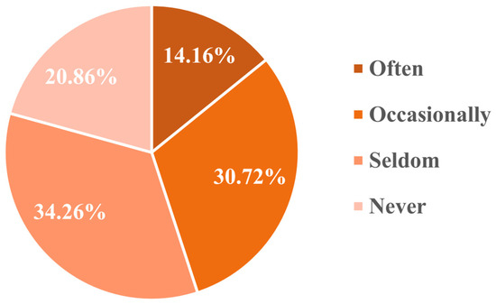 As shown in Figure 5, only 14.16% of the respondents often pay attention to the fire or escape facilities in underwater road tunnels, while 34.26% and 20.86% rarely and never pay attention to these, respectively. As the proportion of people who rarely or never pay attention exceeds 50%, the overall situation is not optimistic. Hence, it is clear that people’s attention to the fire or escape facilities in underwater road tunnels is poor.