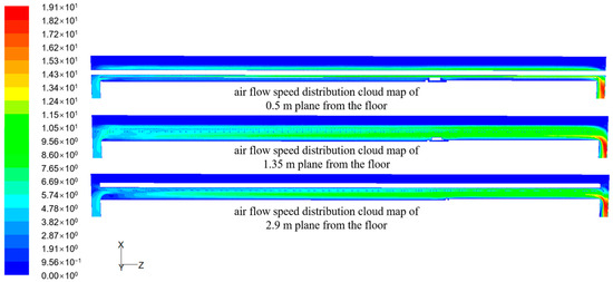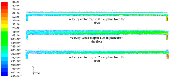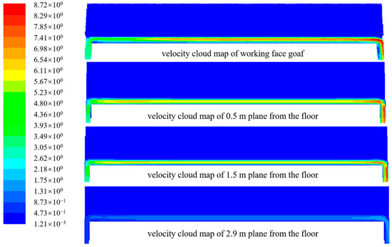 Taking the airflow speed of 2.92 m/s as an example, the distribution law of the airflow field in the working face is simulated. The distribution cloud figure of the airflow field in a fully mechanized caving face is shown in Figure 3, and the vector figure is shown in Figure 4.