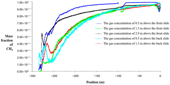 The working face adopts the U-shaped ventilation mode, the average airflow speed of the working face is set to 3.0 m/s, the advancing speed of the working face is 4.8 m/d, the desorption amount of coal seam gas is 3.9 m3/t, the desorption amount of coal body is 36 m3/min, the amount of gas in the goaf into the working face is 3.6 m3/min (10% of the amount of gas emission from the falling coal), and the amount of gas emission from the surrounding rock is 7.2 m3/min (20% of the amount of gas emission from the falling coal). The distribution of gas concentration along the 0.5 m, 1.35 m, and 2.9 m planes from the coal seam floor is shown in Figure 5, and the curve is shown in Figure 6.