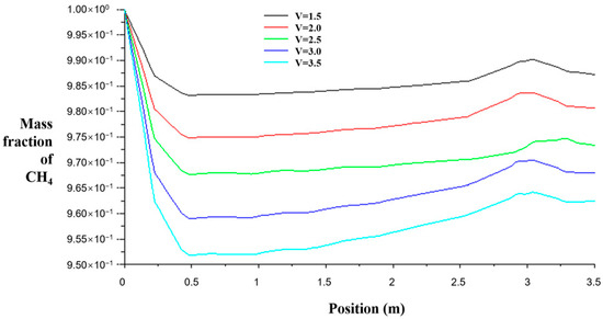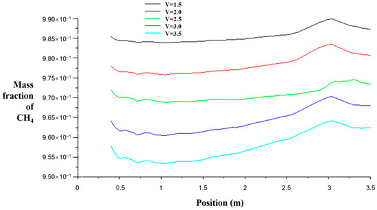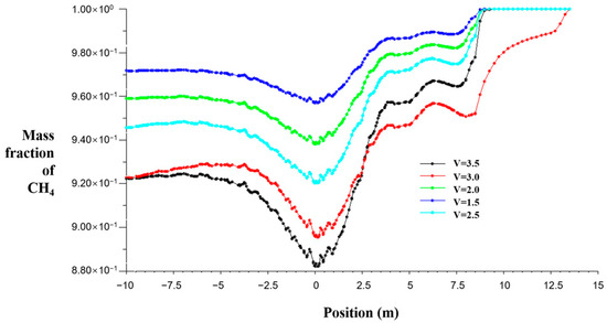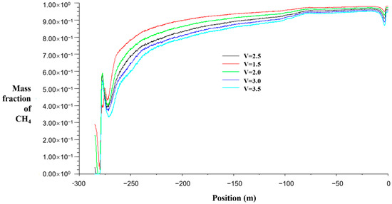 In the case of other conditions unchanged, by changing the velocity inlet conditions, the average airflow speed of the working face is 1.5 m/s, 2.0 m/s, 2.5 m/s, 3.0 m/s, and 3.5 m/s, respectively. The gas concentration distribution along the 1.5 m plane from the coal seam floor is shown in Figure 7, the gas concentration distribution at the 2.5 m distance from the center line of the return air roadway to the coal seam floor is shown in Figure 8, and the gas concentration distribution curve at the upper corner is shown in Figure 9.