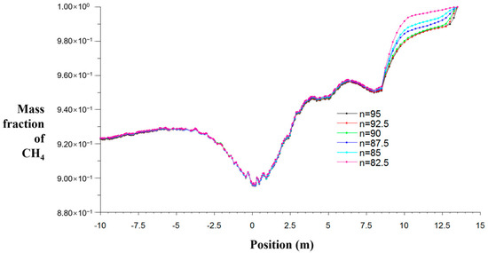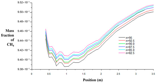 From the figure, it can be seen that the higher the recovery rate, the smaller the gas concentration in the upper corner, mainly because the higher the recovery rate, the less the amount of residual coal in the goaf, the less the amount of desorbed gas, and the less the amount of gas seeping into the goaf, resulting in a weak change in the gas concentration in the upper corner.