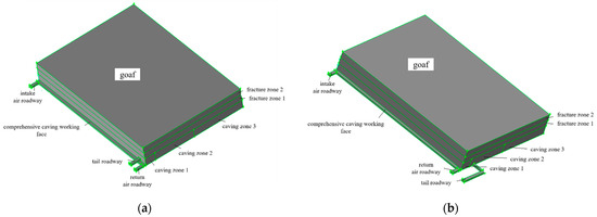 Geometric model of goaf under different types of ventilation modes: (a) the geometric model of goaf under U + I ventilation mode is established; (b) the geometric model of goaf under U + L ventilation mode is established.