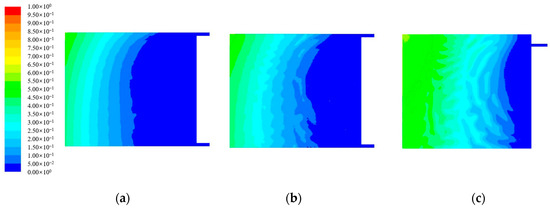 Gas concentration in different horizontal sections of goaf under U + I ventilation mode: (a) gas concentration in goaf at horizontal section position Z = 0 m; (b) gas concentration in goaf at horizontal section position Z = 3 m; (c) gas concentration in goaf at horizontal section position Z = 8 m.