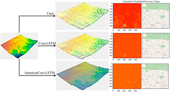 Another innovative model was the Attention ConvLSTM model (model architecture shown in Figure A3), which combined the traditional network of ConvLSTM with a novel temporal attention mechanism that greatly enhanced its ability for dynamic analysis of environmental changes. Based on the effective ConvLSTM model, this innovative model provided the possibility of dynamically changing the attention of Attention ConvLSTM to different points in time by incorporating the mechanism of temporal attention, thereby optimizing the information flow and enhancing sensitivity to critical moments. With the attention mechanism integrated, it provides more accurate, sensitive recognition and prediction of fires against changes with time series, and strong support is possible for response to disasters in a timely manner and effective resource allocation. Moreover, this model, with its multi-layer structure and layer-by-layer information transfer design, further enhances the ability to capture subtle changes in high-resolution remote sensing data. These achievements not only demonstrate the strong potential of deep learning in spatiotemporal data analytics but also bring about a new, effective tool for fire monitoring and other related fields [47,48].