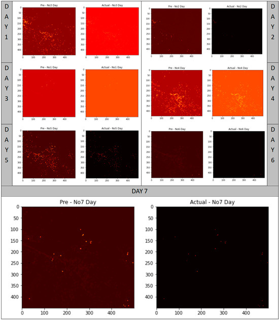 In terms of accuracy and best results in the reduction of loss, the ConvLSTM model presented this, and its training process also showed reliability in Figure 5. The clarity and sparsity of the generated fire images, along with the model, represented very close characteristics of the actual fire event distributions. Finally, Attention ConvLSTM, which builds above ConvLSTM, is slightly suboptimal in its accuracy but promising, especially with hard temporal data.
