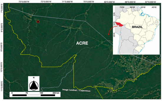 Location map showing the state of Acre in Brazil (right map), and the approximate location of the study area in the western part of the state (black lozenge with a red border)—(7°45′ S and 72°22′ W).