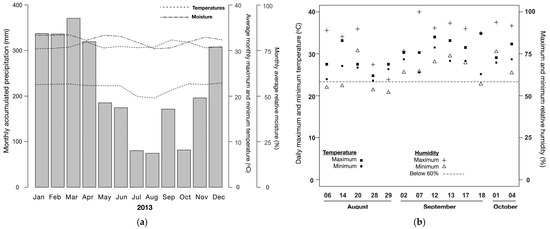 (a) Climatological profile for Acre state, for the period between January and December 2013, with the averages of temperature, humidity, and accumulated monthly precipitation. Source: National Institute of Meteorology database (OMM: 82704). (b) Microclimatic data measured near the sampling units on the days of the surface fire simulation experiment in the understory of an Amazonian forest in Western Acre, Brazil, in August, September, and October 2013. Values refer to the midday period between 11:00 a.m. and 5:00 p.m.