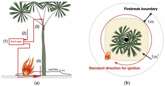 Figure 3. Schematic of the surface fire simulation experiment in the understory of an Amazonian forest in Western Acre, Brazil. (a) Temperature recording method: (1) four-channel datalogger; (2) sensor TK1 ambient temperature; (3) sensor TK2 of the plant apex (inside the bud); (4) sensor TK3 of the plant base: 10 cm above ground and 1 cm from the palm stem surface; (b) top view with the 1 m2 burning area with floor litter; the 1 m circular limit of the safety firebreak boundary (without litter) and the pattern for ignition of the fire.