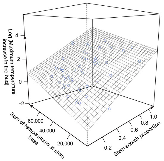 Temperatures measured at the apical bud varied but did not explain mortality. Increasing the percentage of the stem scorched proportion (STSCAR) positively influenced the external (conduction of heat through the plume), and internal (conduction of heat through the palm stem) heat flow in the bud temperature variation. The maximum temperature increased in the center of the apical bud (INCMAX) for all four species except Euterpe precatoria (n = 60), which had a linear relationship with an increasing proportion of stem char plus an increasing sum of temperatures at the base of the palm stem (SUMT) (R2 = 0.53; l.g. = 2.50; F = 30.55; p < 0.001), see Figure 5.