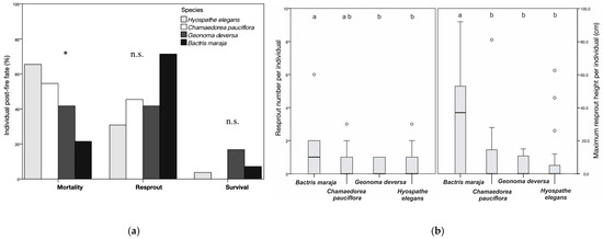 (a) Distribution of individuals of Bactris maraja, Chamaedorea pauciflora, Geonoma deversa, and Hyospathe elegans (n = 60) by total post-fire fate. Mortality (total): mortality without resprout + failed resprout mortality. Resprout (total): basal resprout + apical regrowth. Survival (total): remained alive without resprout. * significant difference in distribution p < 0.05, by Kruskal–Wallis test; n.s.: not significant. (b) Distribution of the number of resprouts and maximum height of post-fire resprouts per individual for the same species (n = 60) (letters above the bars indicate significant difference p < 0.05) from the surface fire simulation experiment in the understory of an Amazonian forest in Western Acre, Brazil.