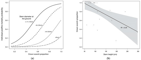 The individual probability of post-fire mortality for the four understory species and Euterpe precatoria was modeled using binary logistic regression (1 for death and 0 for survival or regrowth) [80]. The logistic function was used to convert the linear combination of dependent variables into probabilities. All fire severity variables (CNSCAR and STSCAR) and morphological variables (DS and SH) were included as independent variables. Initially, the models were generated with the independent variables modeled individually, followed by the interactions relevant to biological explanations. Through generalized linear model analysis (binomial GLM), independent variables were included in each regression model when statistically significant (p < 0.05) using the ’stepwise selection’ method. Correlations between variables were examined a priori, and when Spearman’s test values for the correlated pair exceeded 0.5, only one of the variables was chosen for the model. To explore the influence of the edge microclimate on mortality, models were also generated consisting of the orthogonal distance from the edge to the individual and the minimum relative humidity values obtained on the day of each experiment (Figure 2b).