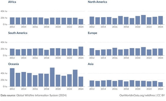 - Annual Area Burnt by Wildfires. Available online: https://ourworldindata.org/grapher/annual-area-burnt-by-wildfires (accessed on 30 October 2024).