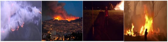 The dataset used in this study contains 11,667 RGB images [28]. The dataset was gathered from two sources: web-based videos and images, and a self-collected tree burning dataset. Frame extraction was performed (30 frames apart) on the videos, and the extracted frames were added to the image dataset, which was then labeled using the LabelImg tool. The dataset was categorized as smoke and fire. The smoke category was the smaller category [28]. Figure 2 shows a sample of four images of forest fires at night. The number of training images: 8494, validation images: 2114, and testing images: 1059.
