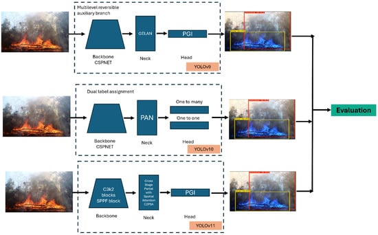 This study utilizes three models for smoke and fire detection: YOLOv9, YOLOv10, and YOLOv11. Figure 4 illustrates the architectures of these models, highlighting their unique design features for effective real-time detection of smoke and fire.