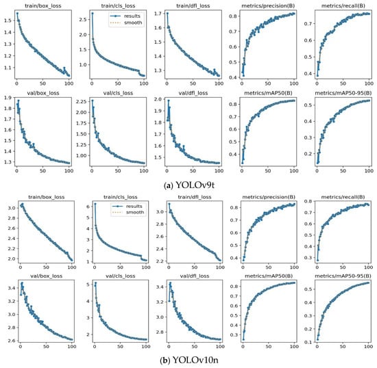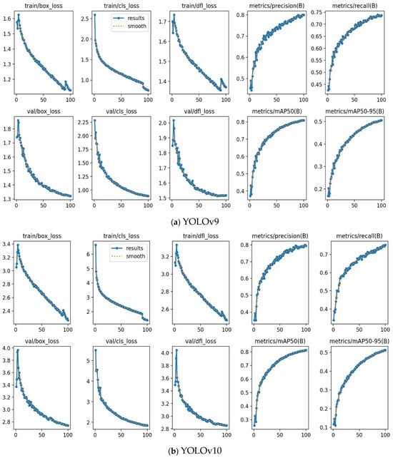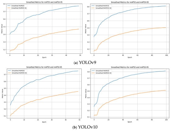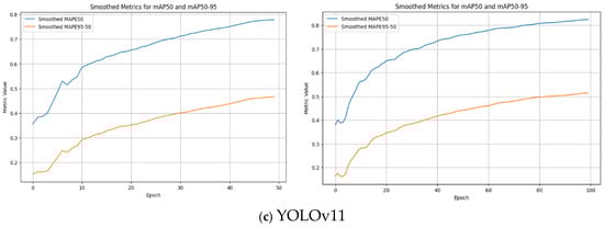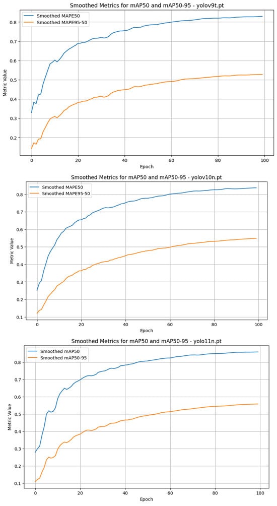 Figure 11 shows smoothed metrics for mAP50 and mAP50-95 during training of YOLOv9, YOLOv10, and YOLOv11 after the parameter changes.