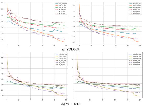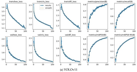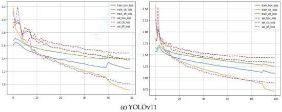 The training and validation losses of YOLOv9 (a), YOLOv10 (b), and YOLOv11 (c) after the parameter changes.